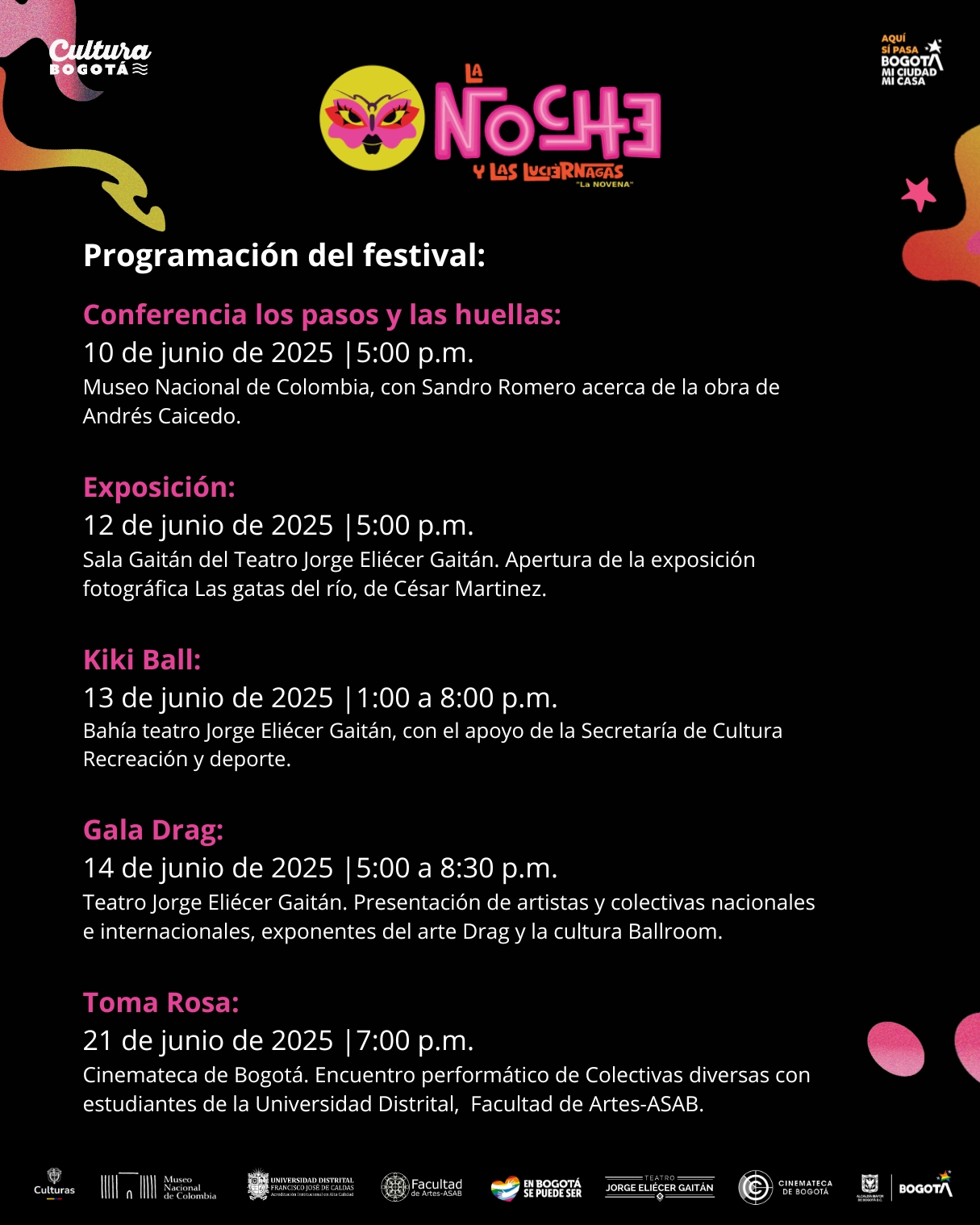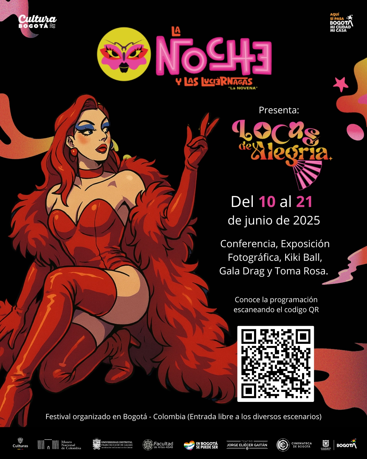 ‣ 14 de junio, escenario central teatro Jorge Eliécer Gaitán, Gala drag Locas de Alegría, 5 a 8.30 p.m., con apoyo de la Facultad de Artes-ASAB.